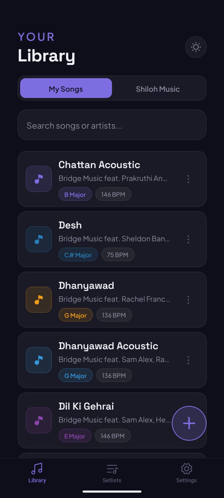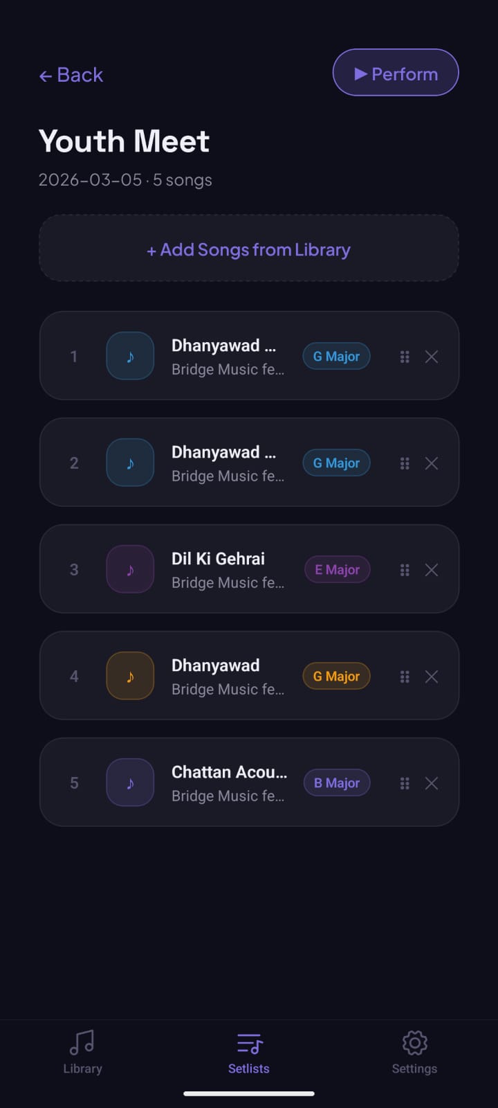 The musician's toolkit for live performance. Manage your song library, build setlists, and perform with confidence — online or off.