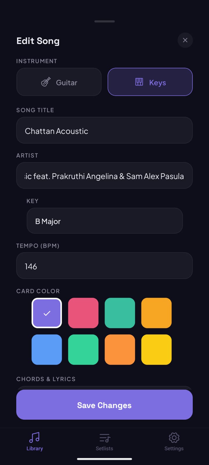 Store chords, lyrics, key, capo, and tempo. Everything you need for every song, right at your fingertips.