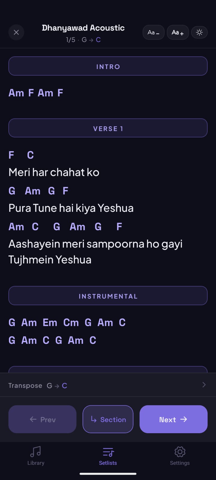 Dark mode, adjustable font size, and full-screen performance view. Designed for low-light stages.